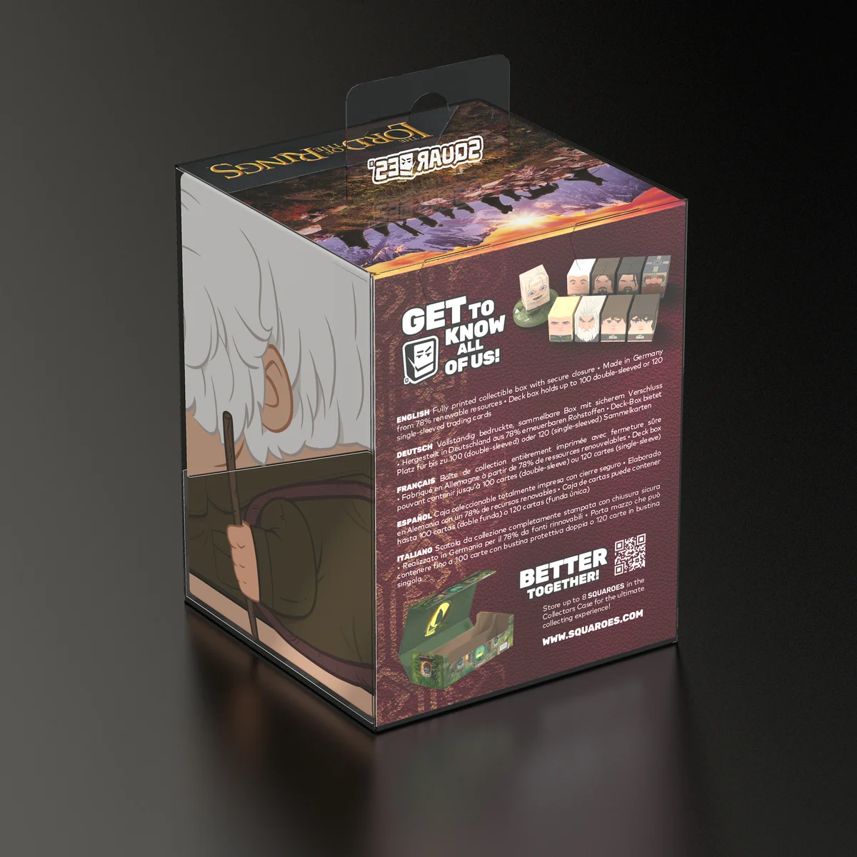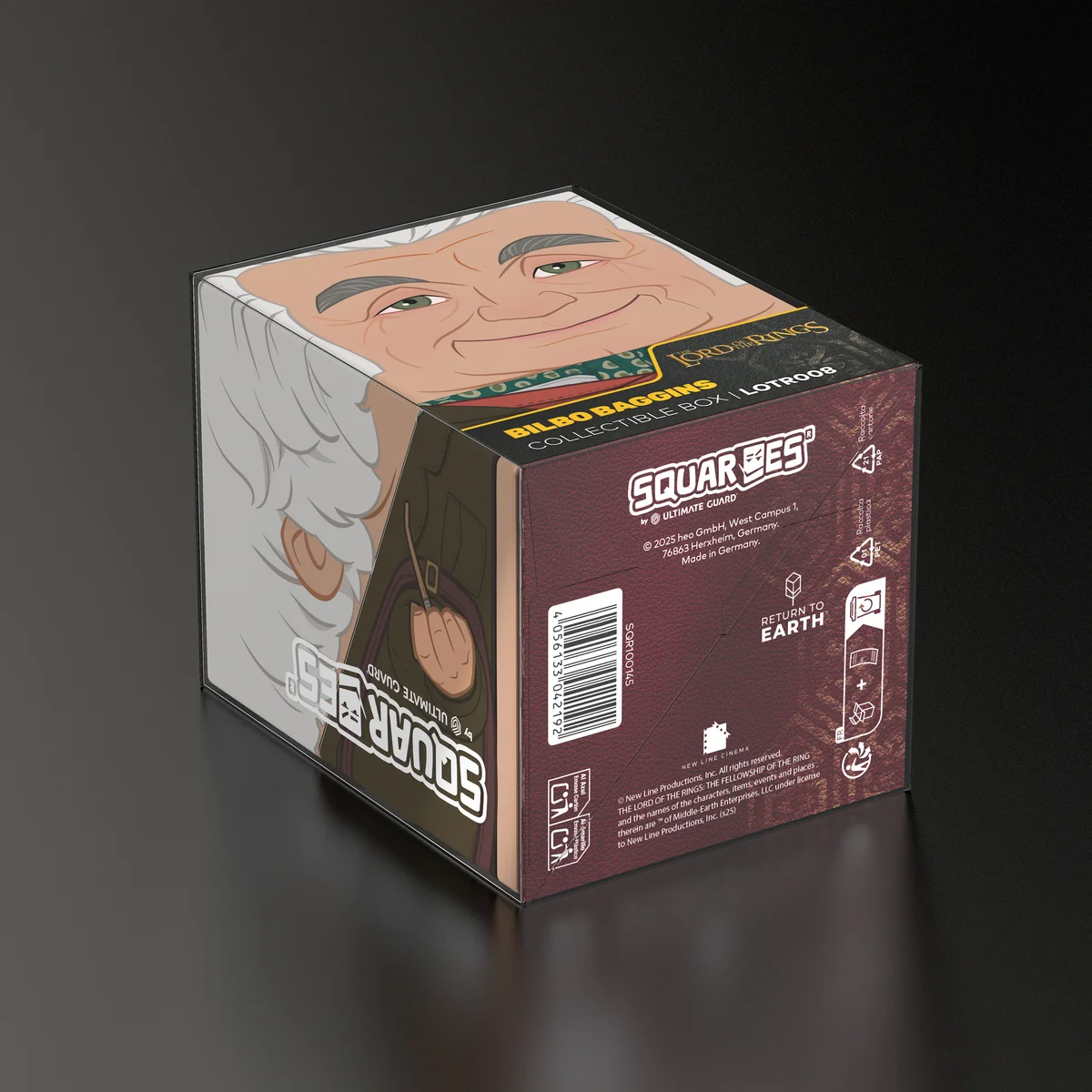 Sammelbare Box zur Aufbewahrung von TCG-Decks, Tabletop-Zubehör und/oder Sammlerstücken. Der Bilbo Baggins Squaroe aus der The Lord of the Rings-Edition bietet als Deck-Box benutzt Platz für bis zu 100 Spielkarten in doppelter Schutzhülle. Squaroes werden aus 78% erneuerbaren Rohstoffen hergestellt und passen perfekt in das separat erhältliche Collectors Case.