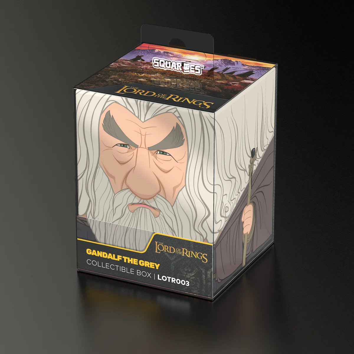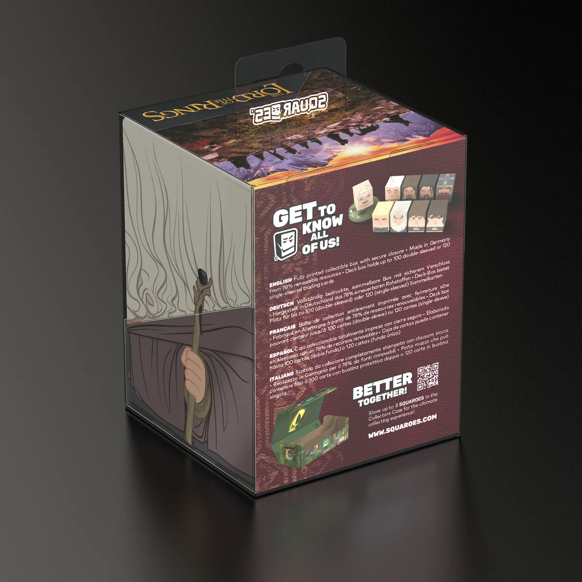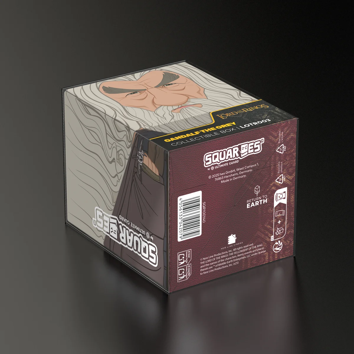 Sammelbare Box zur Aufbewahrung von TCG-Decks, Tabletop-Zubehör und/oder Sammlerstücken. Der Gandalf the Grey Squaroe aus der The Lord of the Rings-Edition bietet als Deck-Box benutzt Platz für bis zu 100 Spielkarten in doppelter Schutzhülle. Squaroes werden aus 78% erneuerbaren Rohstoffen hergestellt und passen perfekt in das separat erhältliche Collectors Case.
