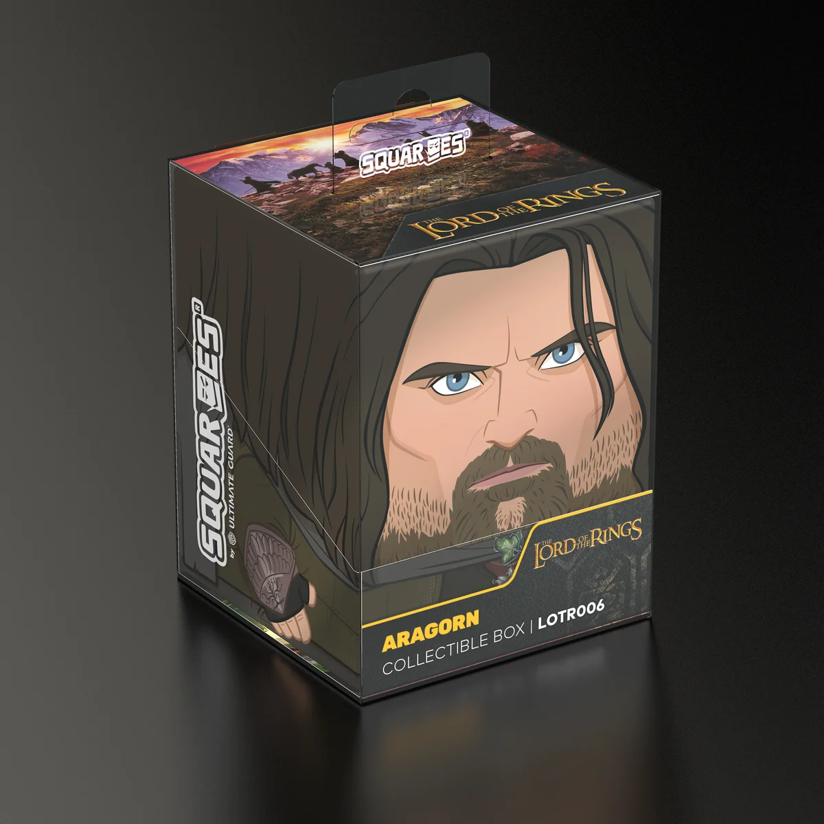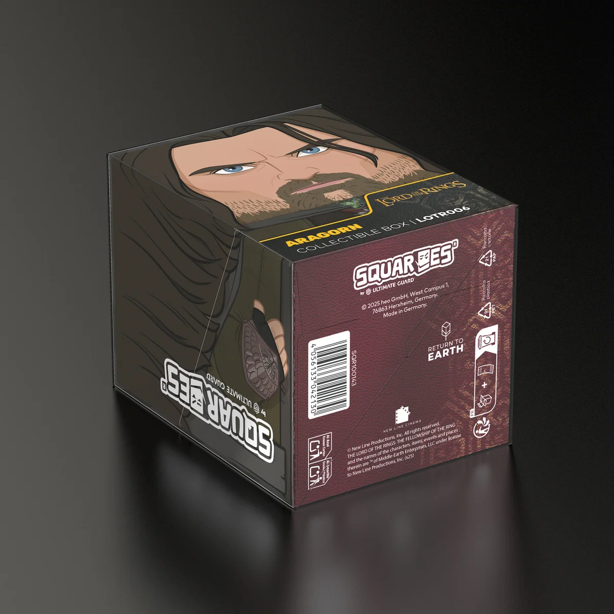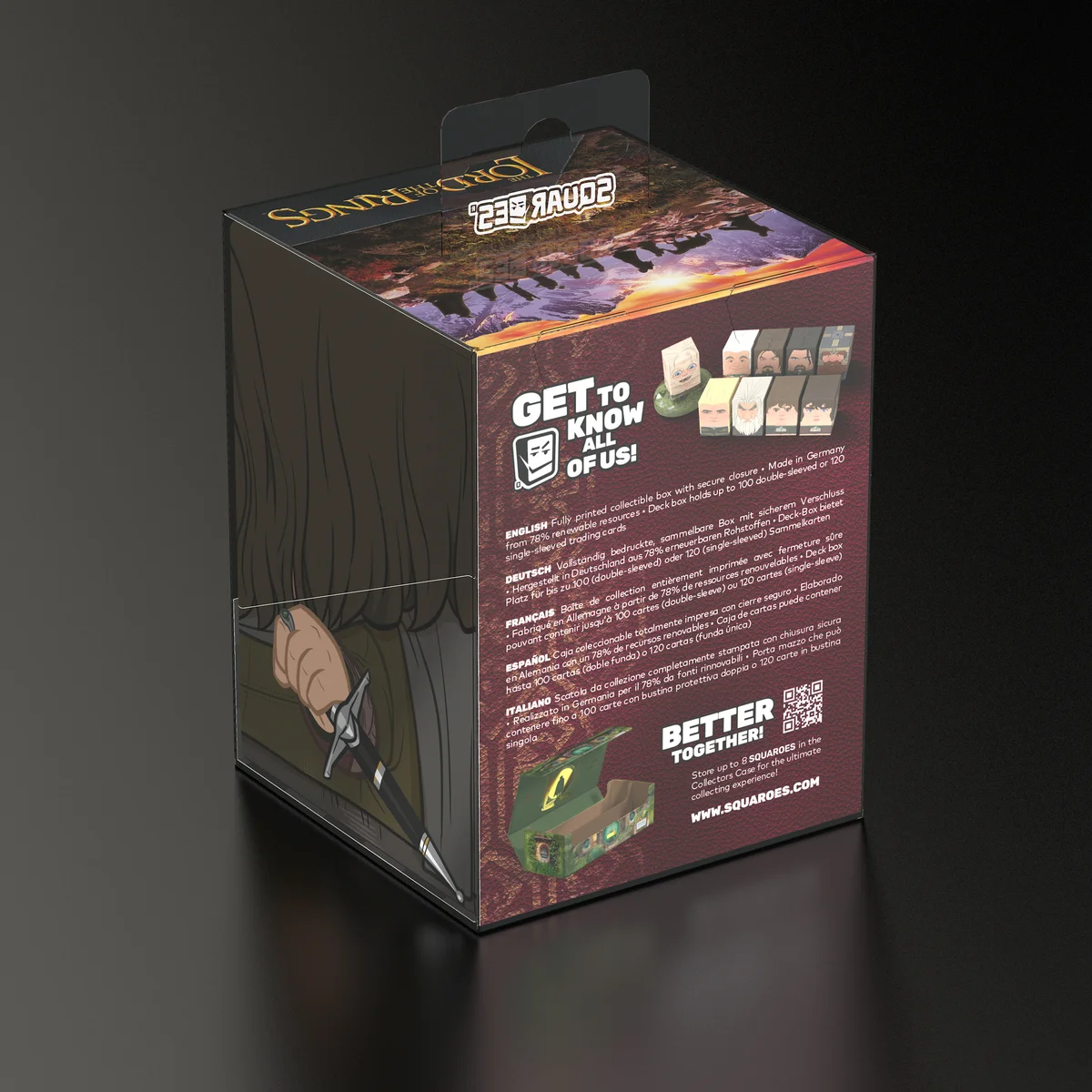 Sammelbare Box zur Aufbewahrung von TCG-Decks, Tabletop-Zubehör und/oder Sammlerstücken. Der Aragorn Squaroe aus der The Lord of the Rings-Edition bietet als Deck-Box benutzt Platz für bis zu 100 Spielkarten in doppelter Schutzhülle. Squaroes werden aus 78% erneuerbaren Rohstoffen hergestellt und passen perfekt in das separat erhältliche Collectors Case.