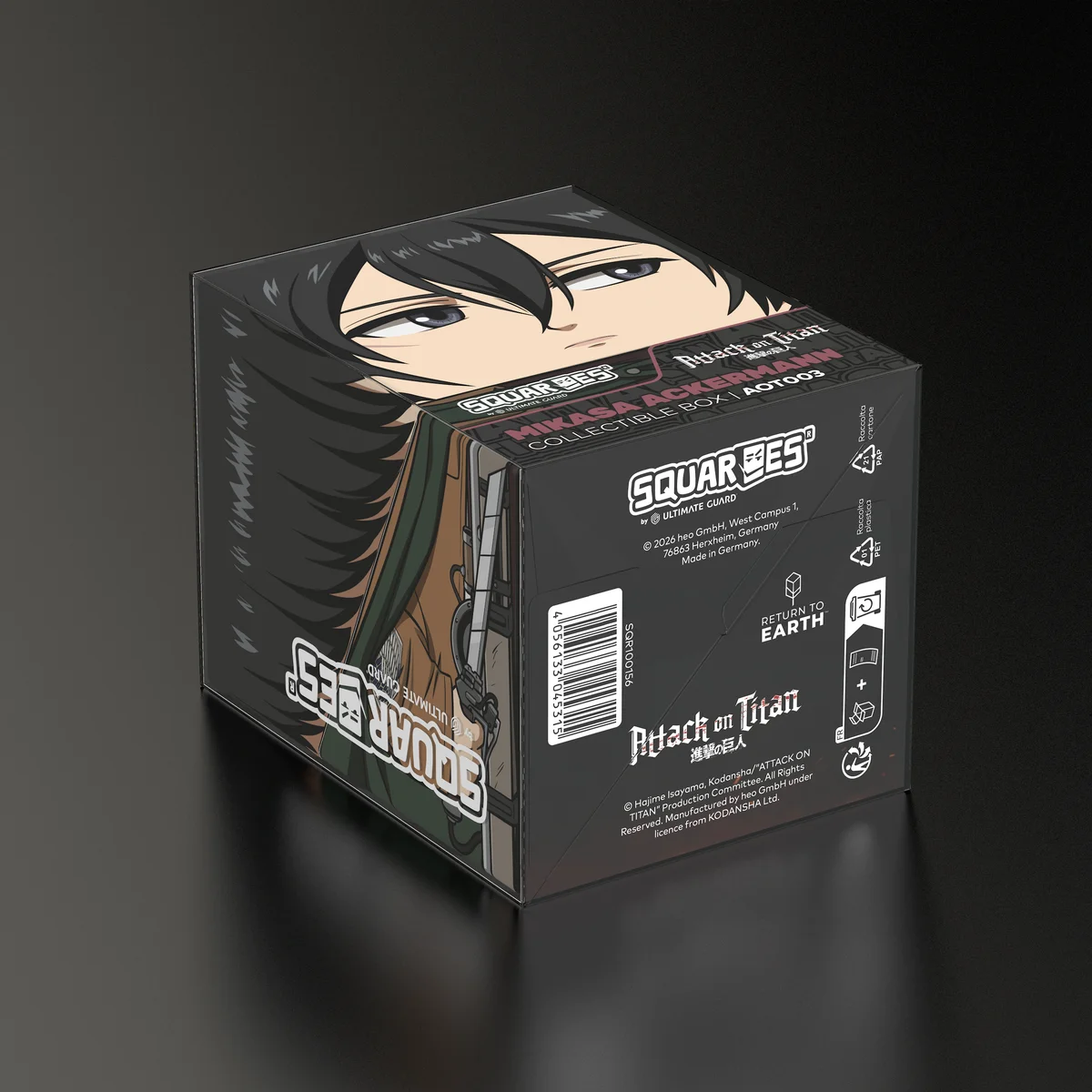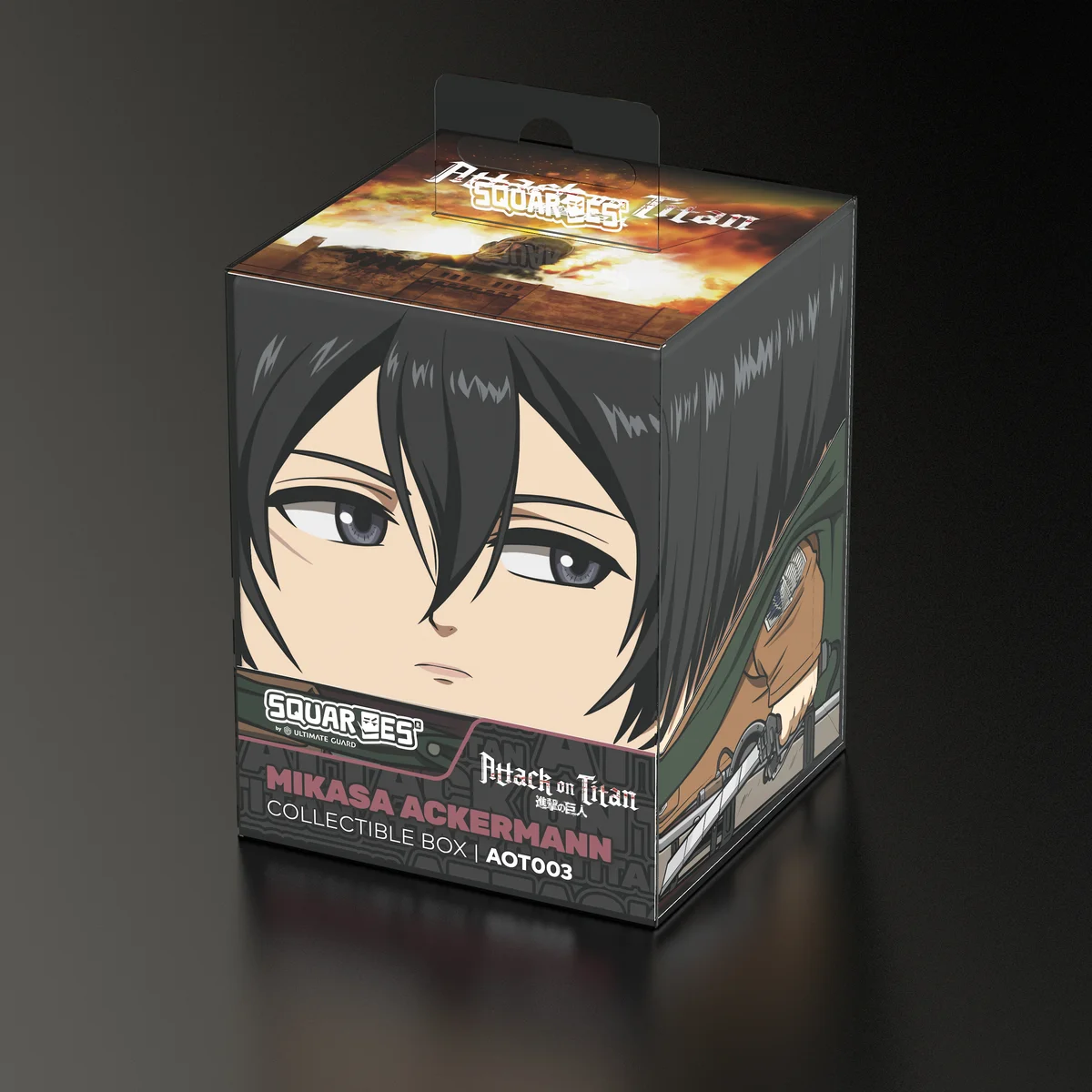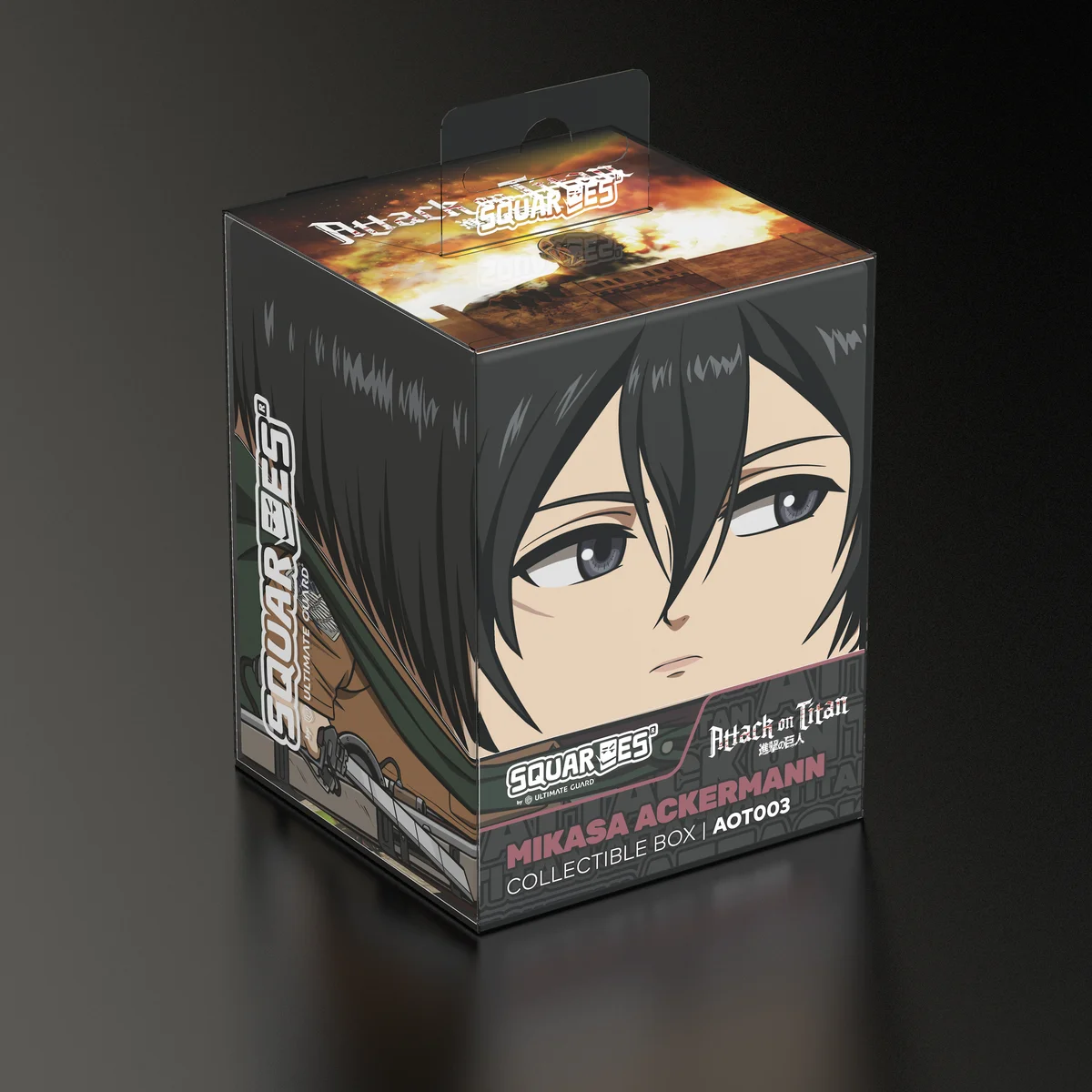 Collectible box for storing TCG decks, tabletop gaming accessories, and/or collectibles. The Mikasa Ackermann Squaroe from the Attack on Titan edition holds up to 100 cards in double protective sleeves if used as a deck box. Squaroes are made from 78% renewable resources and fit perfectly into the separately available Collectors Case.