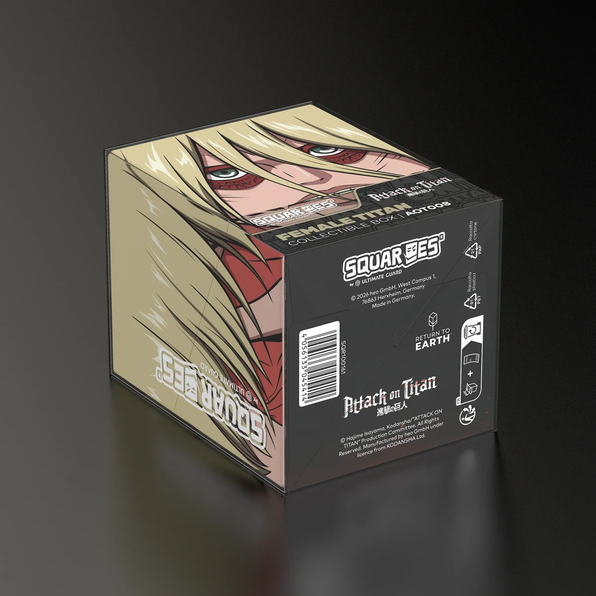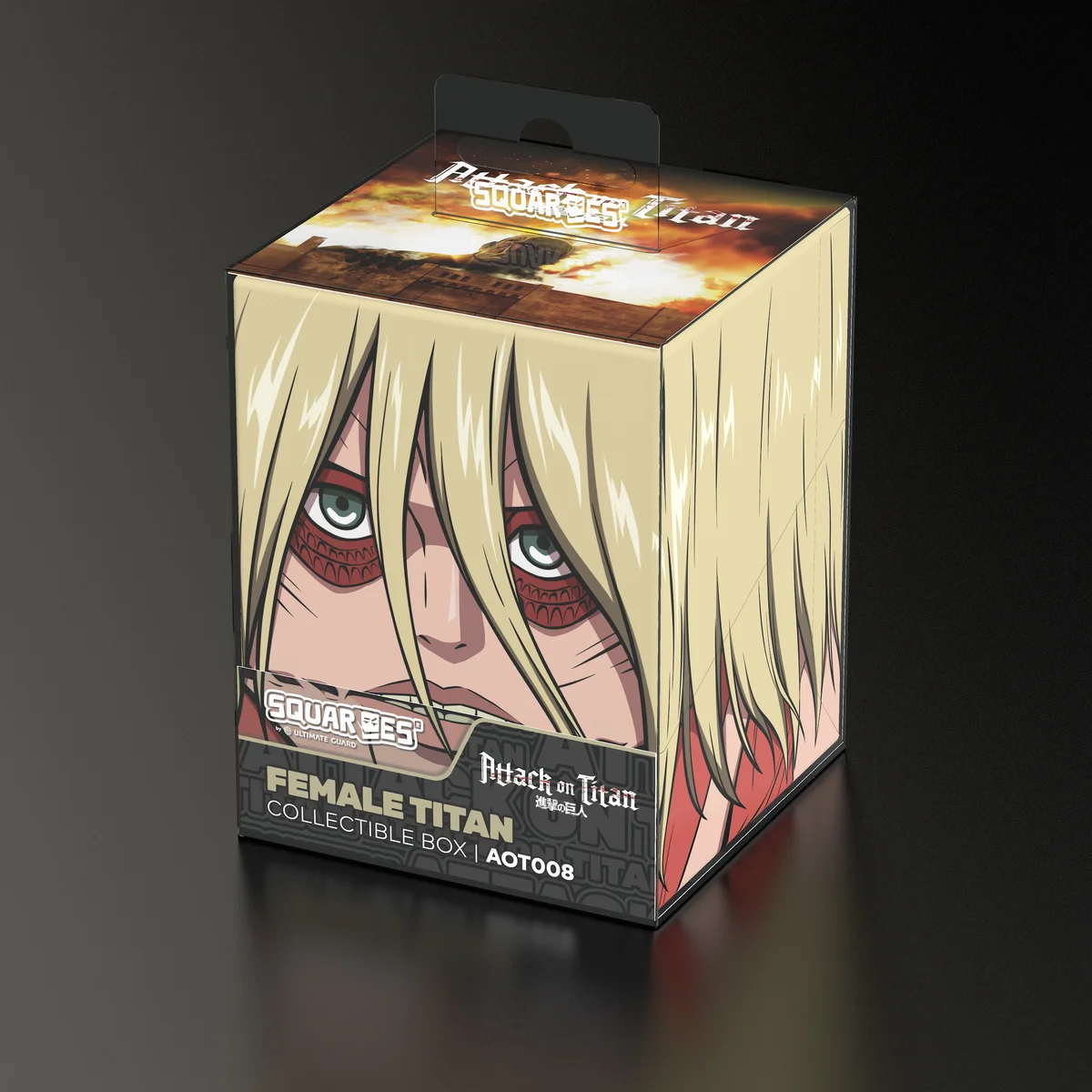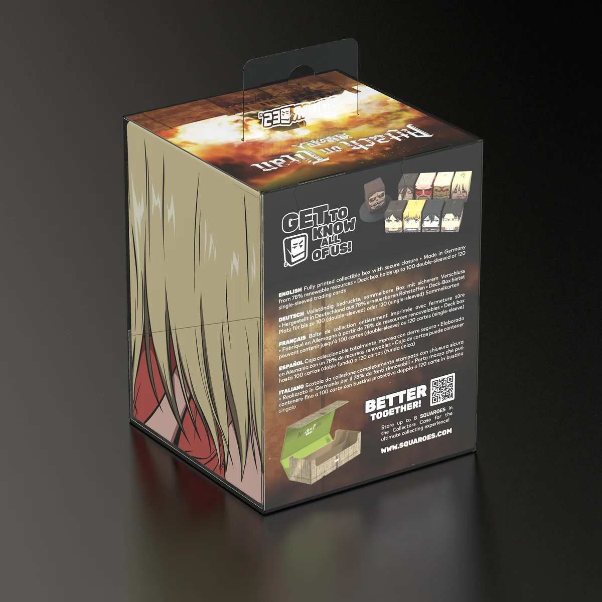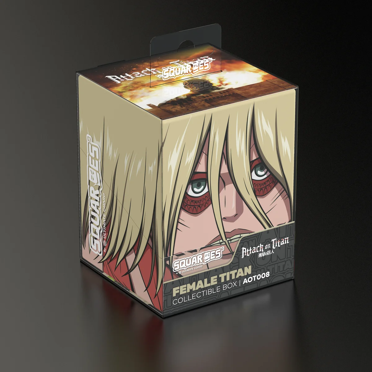 Collectible box for storing TCG decks, tabletop gaming accessories, and/or collectibles. The Female Titan Squaroe from the Attack on Titan edition holds up to 100 cards in double protective sleeves if used as a deck box. Squaroes are made from 78% renewable resources and fit perfectly into the separately available Collectors Case.