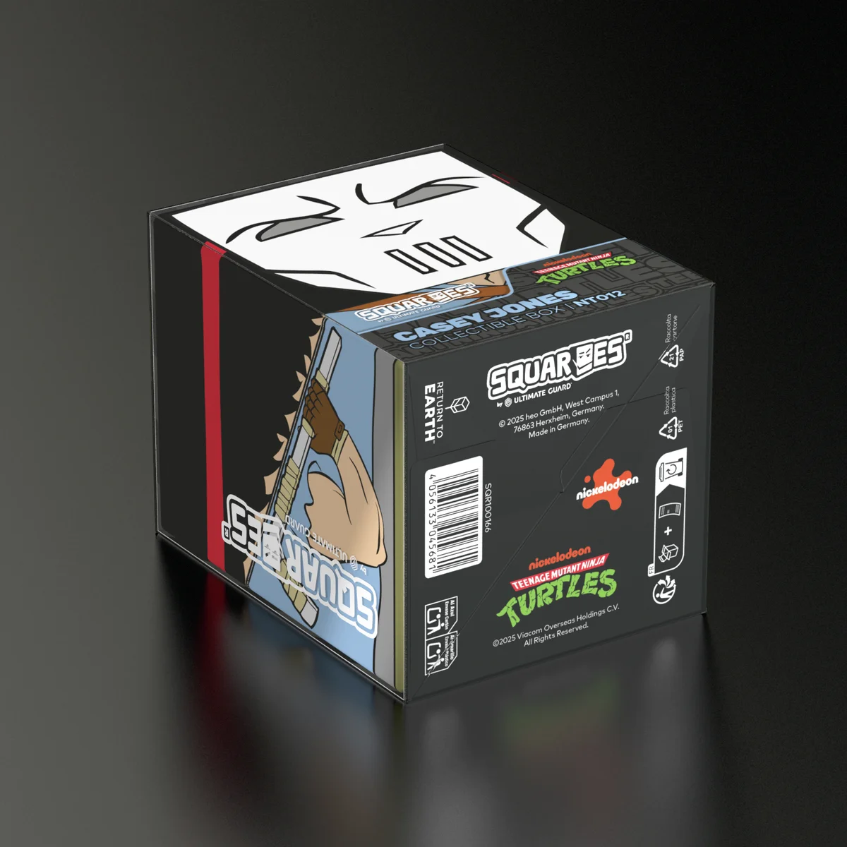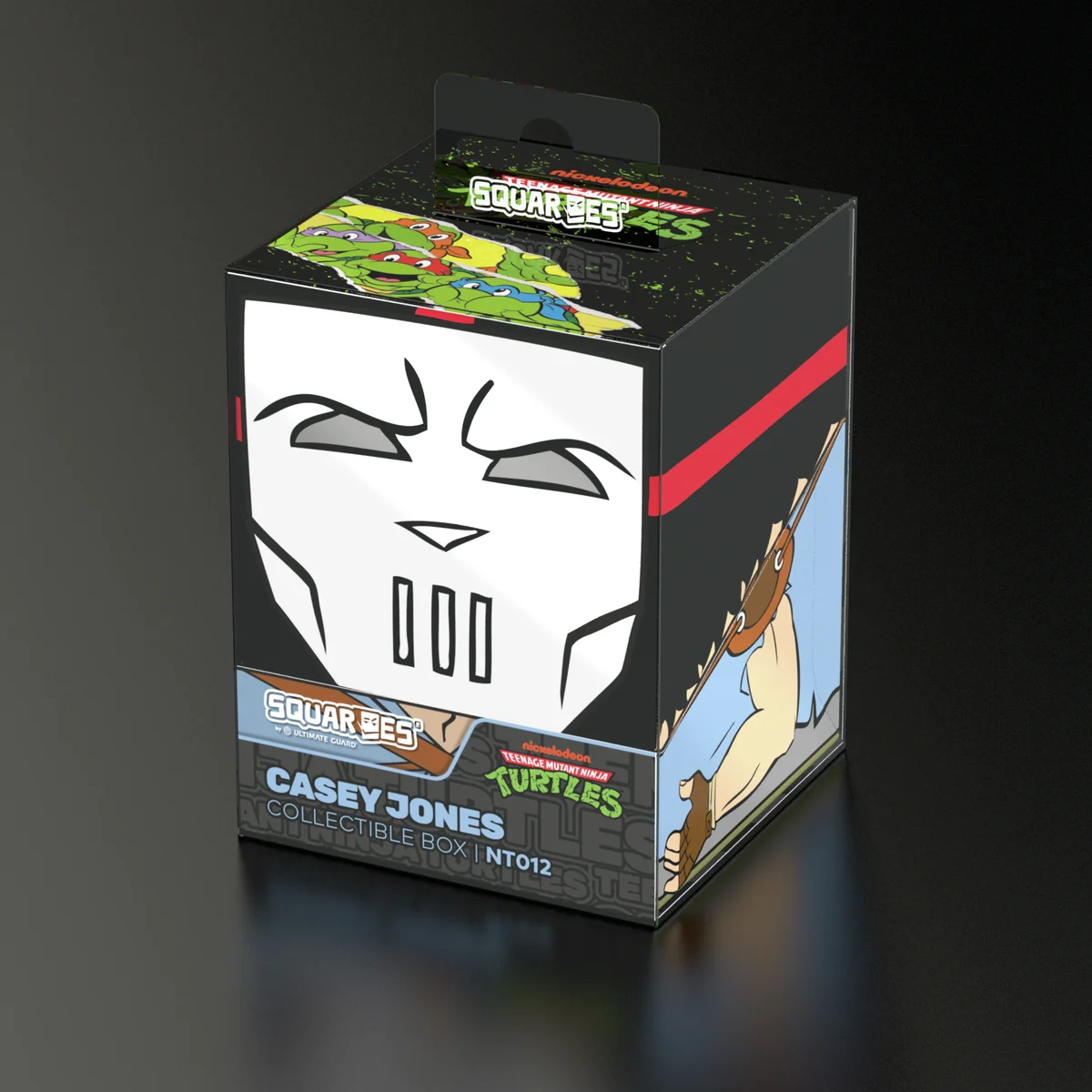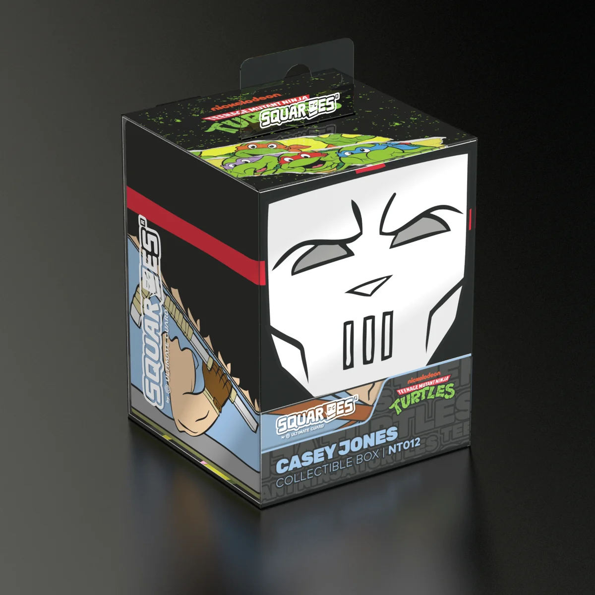 Collectible box for storing TCG decks, tabletop gaming accessories, and/or collectibles. The Casey Jones Squaroe from the Teenage Mutant Ninja Turtles™ edition holds up to 100 cards in double protective sleeves if used as a deck box. Squaroes are made from 78% renewable recources and fit perfectly into the separately available Collectors Case.
