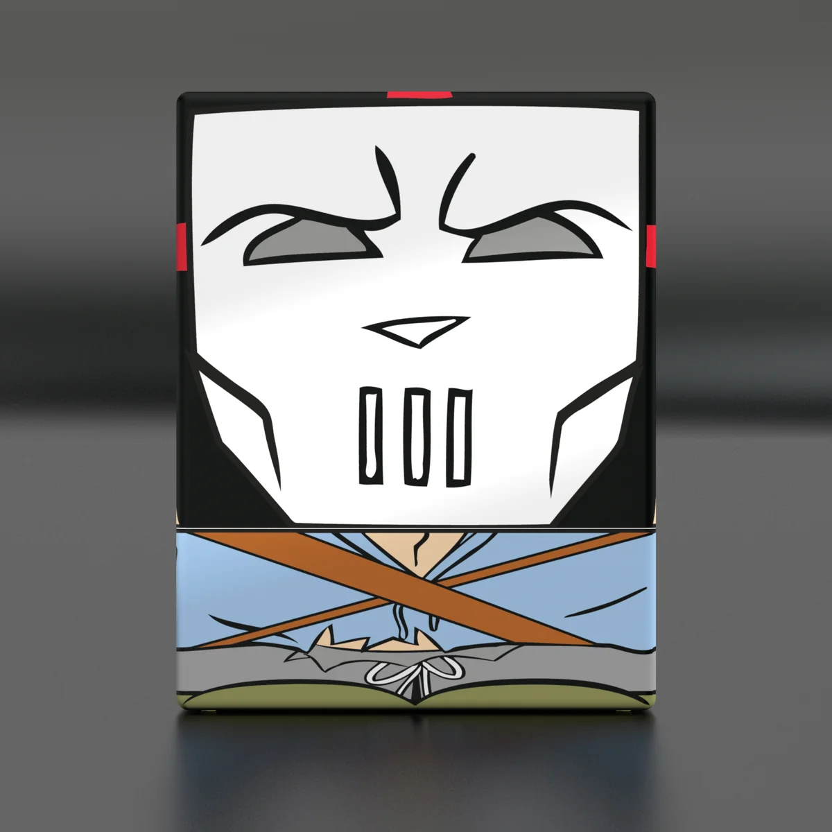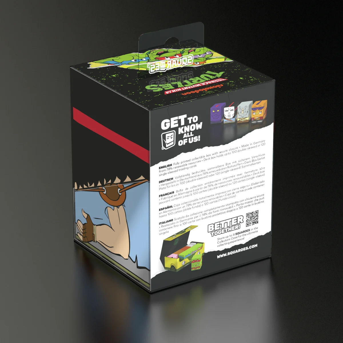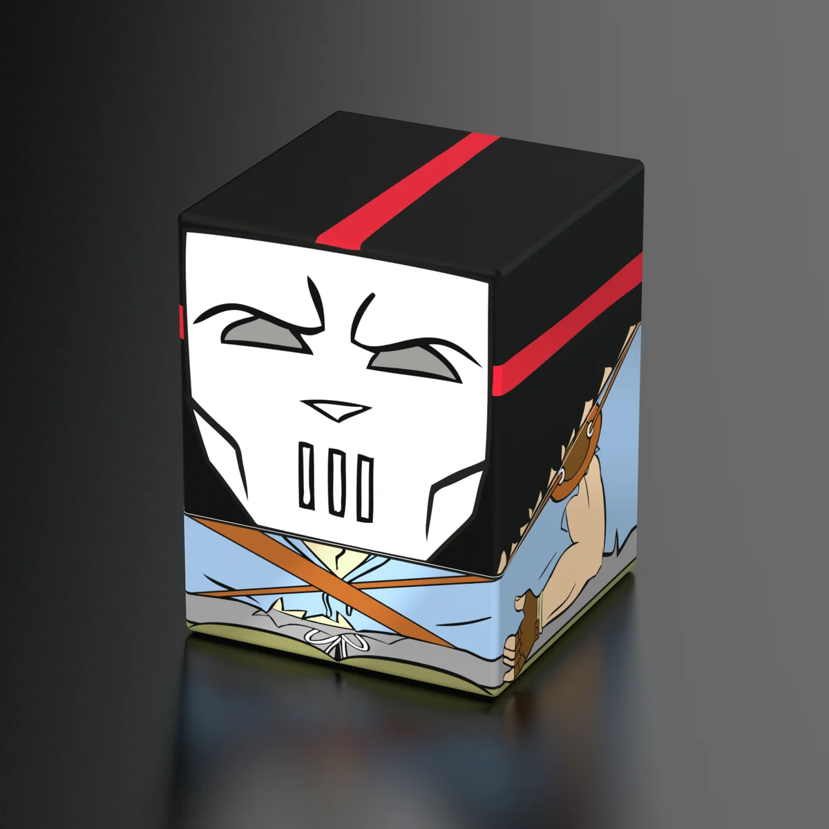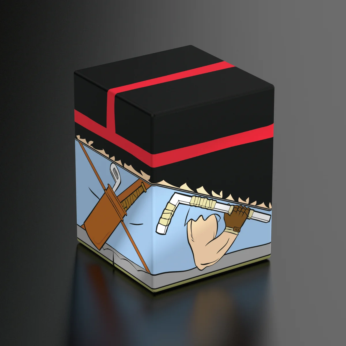 Collectible box for storing TCG decks, tabletop gaming accessories, and/or collectibles. The Casey Jones Squaroe from the Teenage Mutant Ninja Turtles™ edition holds up to 100 cards in double protective sleeves if used as a deck box. Squaroes are made from 78% renewable recources and fit perfectly into the separately available Collectors Case.
